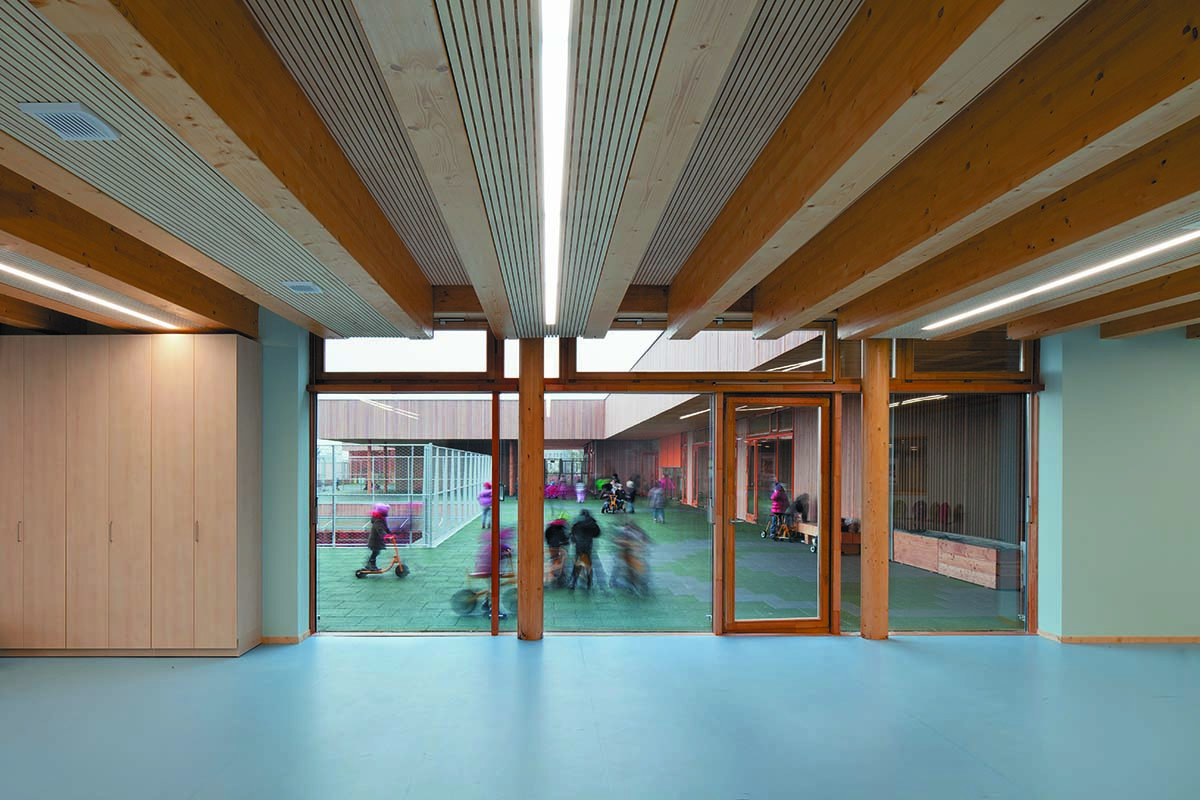 Le projet est étudié et bâti en 18 mois avec une procédure conception réalisation ; avec une équipe de 25 architectes et ingénieurs les plans et détails ainsi que les panneaux préfabriqués en atelier en Allemagne par les charpentiers d’Amann permettent cet exploit. Les composants de structure comme le Lignotrend sont aussi des éléments finis visibles dans les classes. Des équipements électriques sont incorporés en atelier.