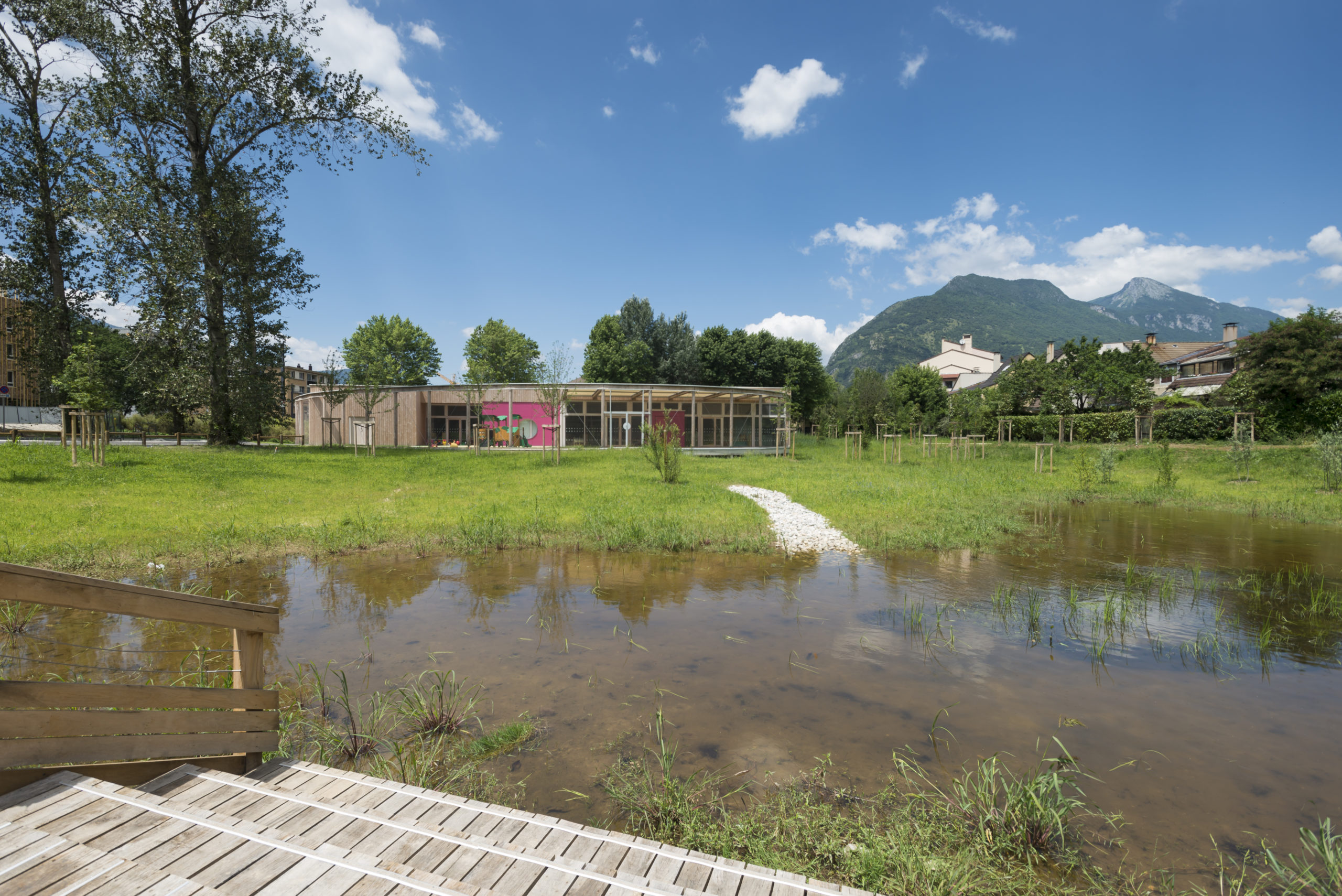 Posé sur pilotis, le bâtiment a un faible impact sur la zone humide. Construit en bois des alpes, il est certifié circuits courts. Le plancher chauffant basse température est doublé d’un rafraîchissement sur eau de nappe pour le confort des bébés, les apports internes par les enfants étant importants. Par ailleurs les terrasses sont protégées avec des vélums.